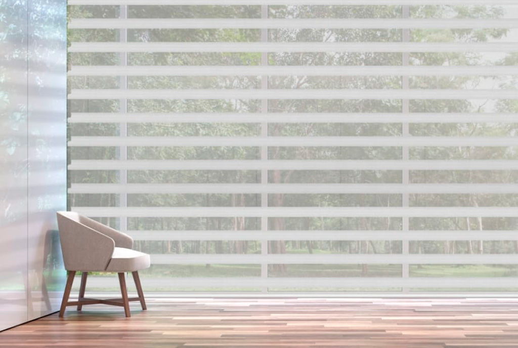 Cortinas con un diseño sofisticado por una combinacion de tejidos transparentes y opacos, logrando asi un mayor paso de luz por su velo o logrando privacidad casi total cuando este totalmente cerrada.